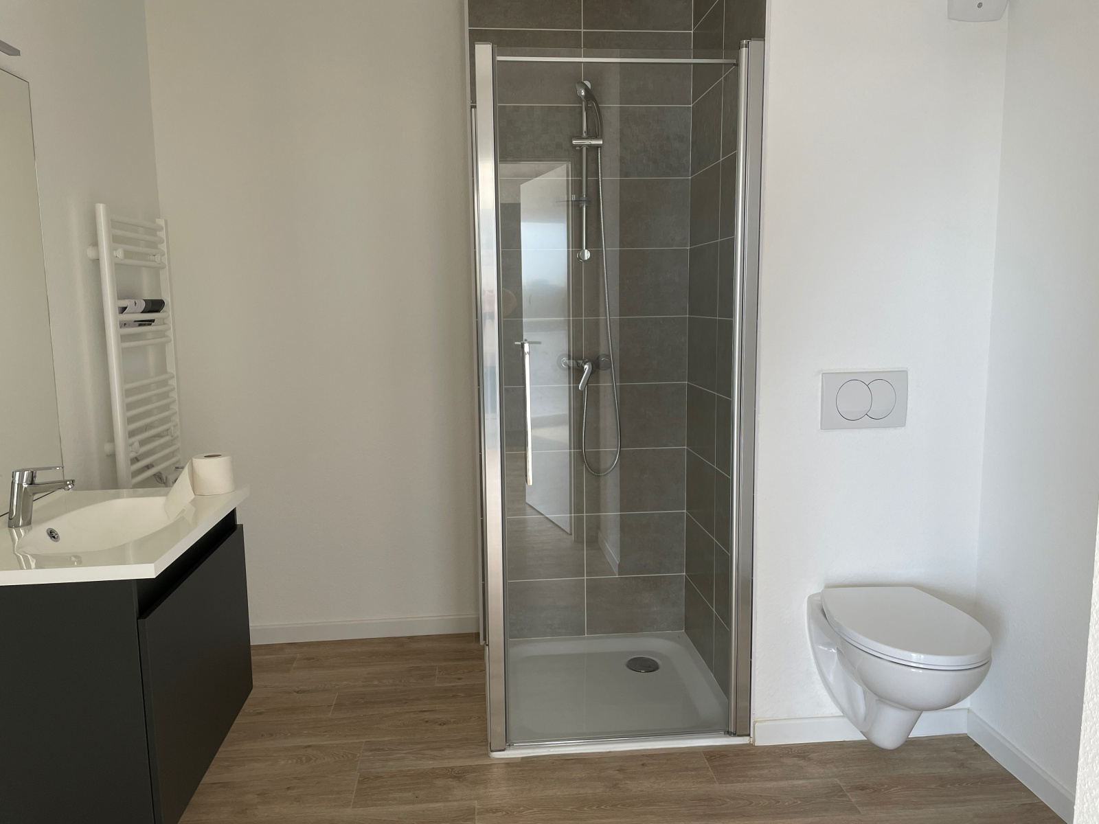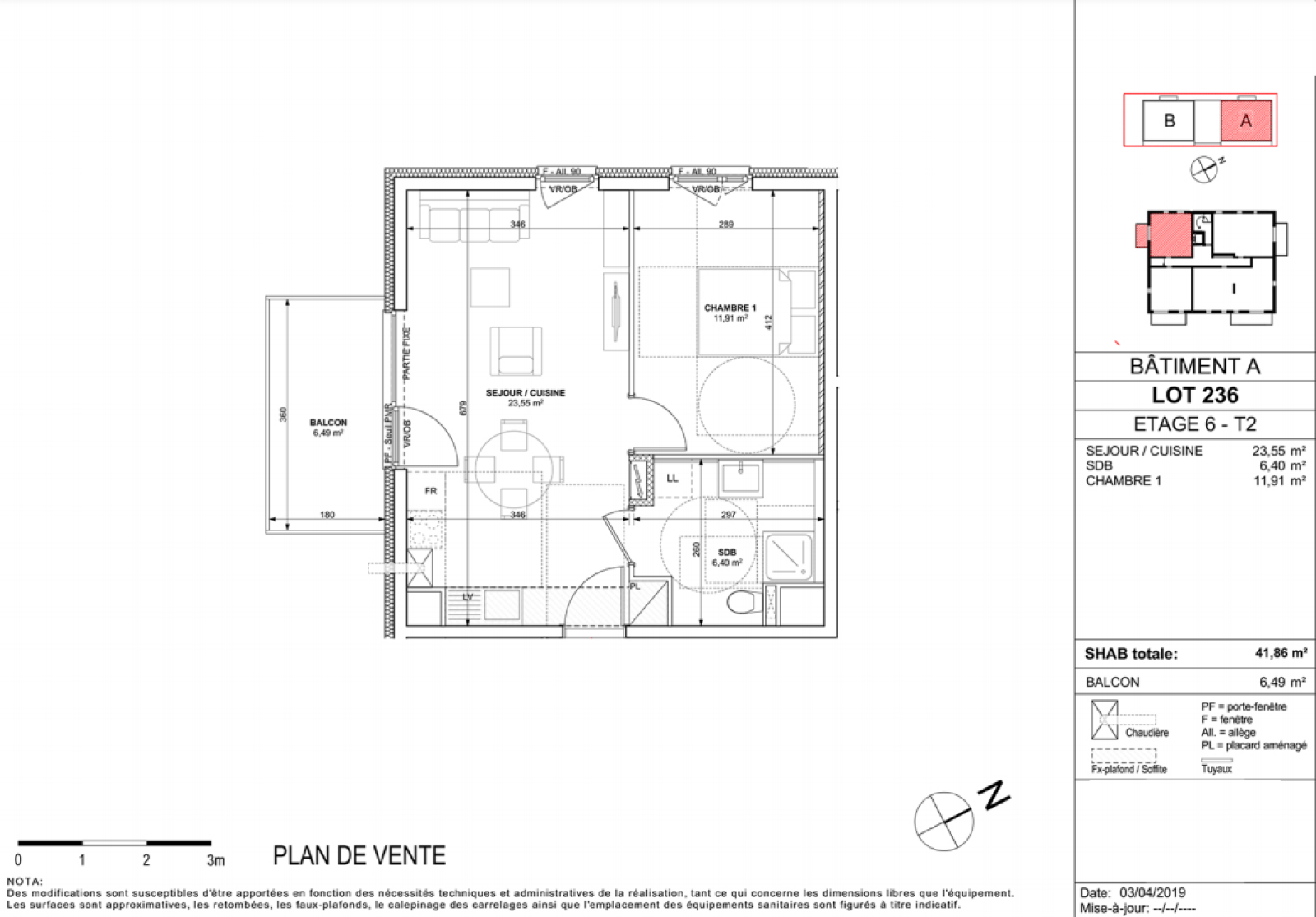 Il se compose d'un séjour-cuisine de 23.55m² donnant sur un balcon de 6,49 m², d'une salle de bain (radiateur sèche serviettes, meuble vasque avec miroir et éclairage) avec WC et une chambre de 11.91m².